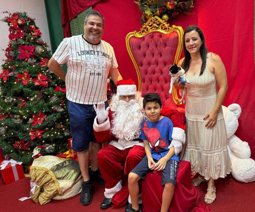 O servidor municipal Luiz Otávio Fritolli, o Tatá, foi literalmente em família ver o Papai Noel. Estava acompanhado da esposa Evelin, do filho Matheus (11) e do cachorro de estimação, Kim. “Levei uma conversa particular com o Papai Noel e pedi de presente para ele os seis números da Mega Sena da virada”, divertiu-se.