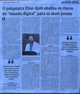 Trata-se de um trabalho que teve como inspiração uma entrevista publicada no informativo da ACIMM (setembro/outubro) com o médico psiquiatra Dr. Elias Ajub, quando abordou a questão do uso de telefones celulares por crianças, com a complacência dos pais. Na referida entrevista, Dr. Elias utilizou o termo “zumbis digitais” para expressar sua preocupação em relação aos prejuízos que esse tipo de permissividade poderia ocasionar na formação da personalidade das gerações mais novas.