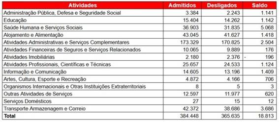 A atividade de serviços abriu 18.813 postos formais em maio, resultado de 384.448 admissões e 365.635 desligamentos. No acumulado do ano, registrou saldo de 169.723 vagas líquidas.