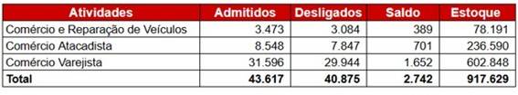 Assim como no Estado, o Comércio paulistano também exibiu saldo positivo, com a geração de 2.742 vínculos celetistas, resultado de 43.617 admissões e 40.875 desligamentos. O estoque total de empregos formais no setor subiu para 917.629 vínculos ativos [tabela 3].