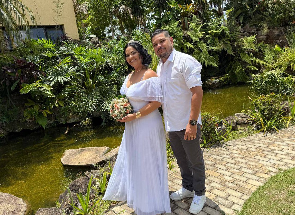 O sábado, 25 de outubro, foi bastante especial para o casal Leandro Ferreira, de 35 anos e Thaís Ferreira, que estavam se casando. Os dois reservaram um tempinho no final da manhã para vir, acompanhados de uma profissional da área de fotografia contratada para documentar as bodas, fazer uma sessão de fotos na sede da ACIMM. “Achei perfeito, maravilhoso”, opinou a moça a respeito da escolha, diante do olhar de aprovação do marido